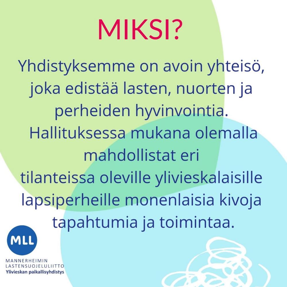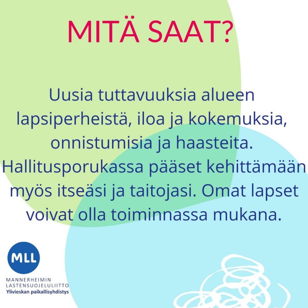 Yhdistyksen hallituksessa voit löytää oman tapasi olla avuksi alueen lapsiperheiden hyvinvoinnin edistämisessä. Joukkoon tarvitaan niin toiminnan kehittäjiä, yhdistyksen rutiineista huolehtijoita kuin tapahtumissa avustajia. Kun tekijöitä on monta, kukaan ei kuormitu liikaa, ja toiminnan keskiössä pysyy ilo.